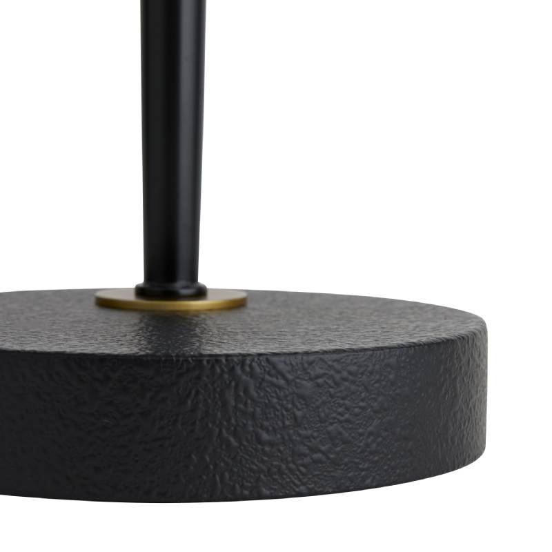 This tabletop version of one of our most popular floor lamps (79680) is perfect for desks and nightstands. The antique black iron and antique brass design exudes a modern sensibility. The off-white linen shade swivels and houses two light bulbs, creating an even light source.