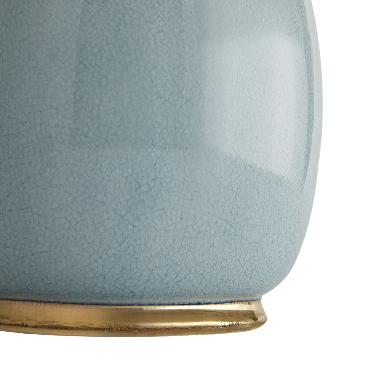 The traditional shape of this porcelain lamp features an elongated ribbed neck that towers the top of a rounded base. A celadon finish pulls where the neck and base connect delivering an eye-catching element that accentuates its feminine frame. Showcased on a gold-finished platform for a more polished appeal—a quintessential luminescent for traditional spaces. Topped with an off-white linen drum shade with off-white cotton lining and a matching porcelain finial. finish will vary.