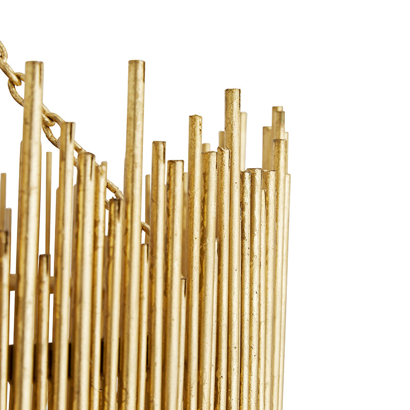 Individual iron rods are welded together and hand-finished with gold leaf to create this three-tier chandelier. The entire piece is leafed all the way up to the ceiling mount.