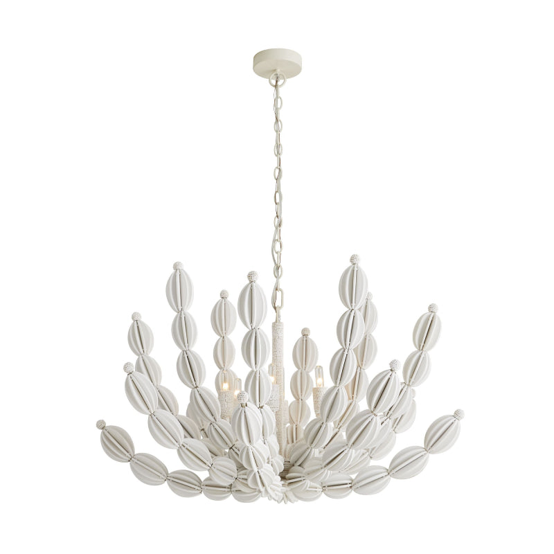 Southwest inspiration meets unconventional design to create this overtly organic chandelier. A white iron foundation is encased by a matching white wood, carved in a cactus-like arrangement. Each arm has been embellished with clusters of coco shell, a detail that further plays up its perennial inspiration. The unique shape slightly conceals six bulbs that brilliantly illuminate a space, while working in tandem with the design to create an even more brilliant shadow play. Though its characteristics favor greenery, it is a perfect addition to coastal settings.