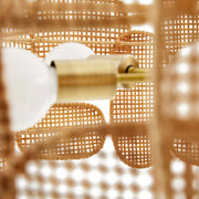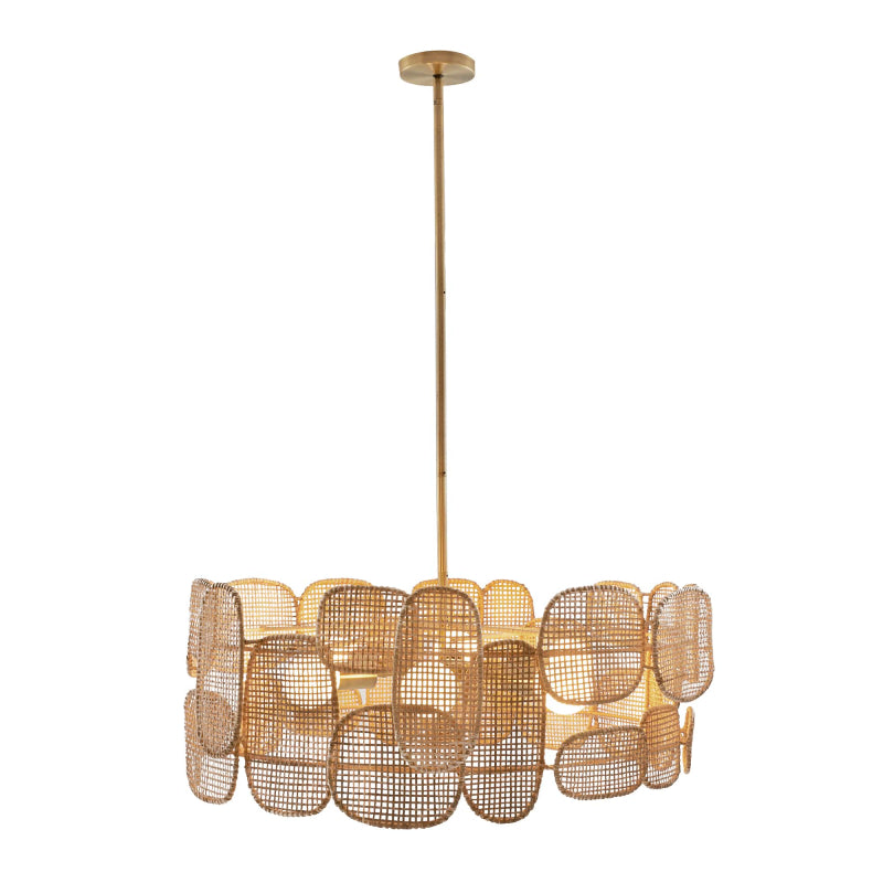 Earthy natural rattan is translated into an elevated drum-shade silhouette. Our Ronaldo is crafted in layers of pillowed forms, creating a sculptural effect. The accent radiates a warm glow as light filters through the basket-weave construction. Antique brass iron forms the chandelier’s framework and pipes.