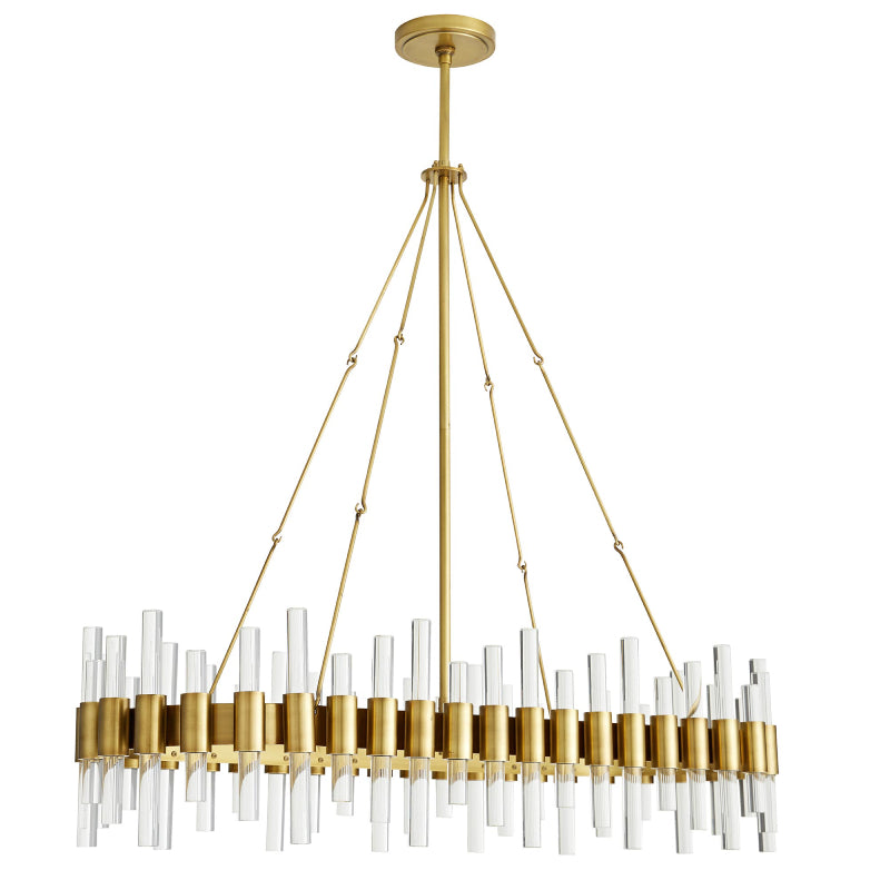 Antique brass and clear acrylic are the perfect pair on this oval-frame steel chandelier. Forty pillars of clear acrylic create a stunning design and add extra shine.