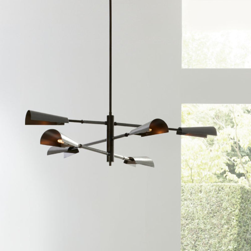 Both masculine and modern, the English bronze-plated steel Estevan adds hint of industrial Americana to any setting. We suspended sextet of graphite leatherwrapped shades from a slim english bronze arm to allow adjustable, multidirectional illumination.