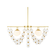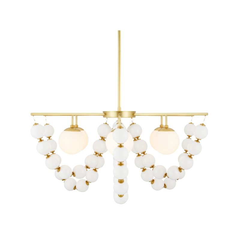 The lavishness of layered necklaces is reflected in the jewelry-inspired Genesis. Swagged and draped along a framework of antique brass-plated steel, strings of opal seedy glass baubles add a dramatic accompaniment to opal glass shades. With a framework, pipe, and canopy of antique brass-plated steel, this elegant fixture adds instant glamour wherever it is placed. Damp-rated, although limited covered outdoor areas may affect finish.