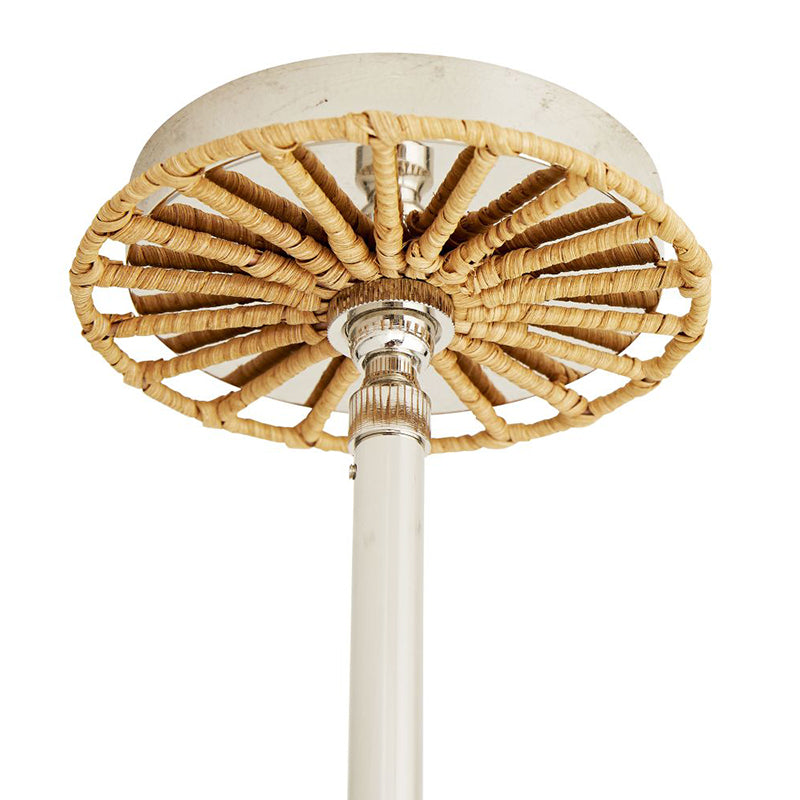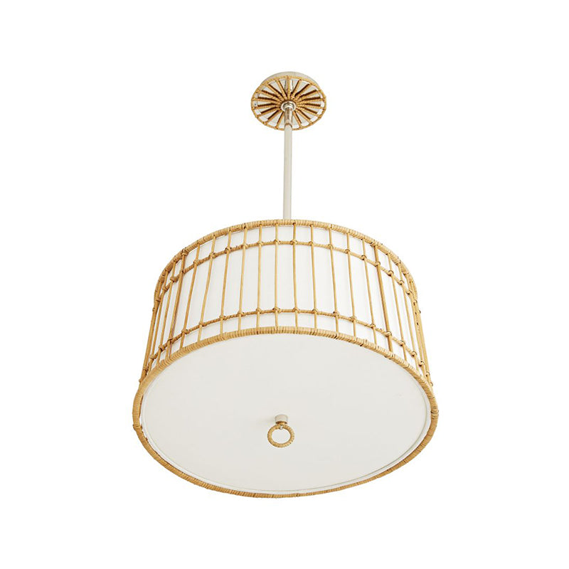 Recalling the humble yet complex architecture of a wicker basket the Sea Island Pendant has a rattan structure and an ivory linen-wrapped interior.