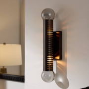 Our English bronze-plated steel sconce with a pair of smoke crystal ball has a handsome machined look that is even more eye-catching when paired or tripled. Its balance of linear and round elements lends an architectural presence to a hallway or corridor, while slotted perforations allow for an enchanting bleed of light. Damp-rated, although limited covered outdoor areas may affect finish.