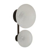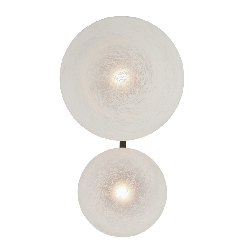 An English bronze-plated steel backplate suspends dual shades of matte swirl glass, mimicking stars strung throughout a constellation. This simple yet impactful style dazzles from every angle. Damp-rated, although limited covered outdoor areas may affect finish. Finish will vary.
