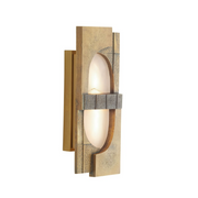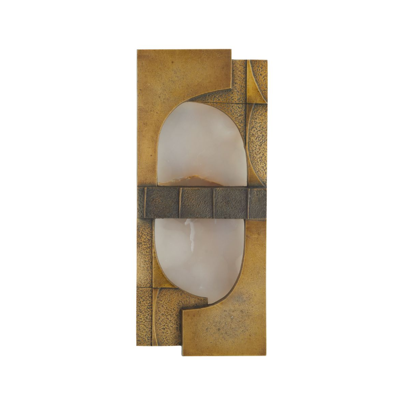 Like a work of Brutalist sculpture, this museum-quality sconce has an abstract quality. Delivering a balance of masculine and feminine elements, a rectangular shade of white onyx is suspended in a frame of antique brass-plated cast iron. Both grooved and textured, it is bisected with a ribbed English bronze plated iron band for contrast. Integrated LED bulb. Damp-rated, although limited covered outdoor areas may affect finish. Finish will vary.