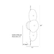 A slim kabob-like backplate lends a pierced effect to shades of hand-blown white glazed glass. Offering a mix of transparency and opacity, each free-form shape is secured with a steel antique brass finial detail and will differ slightly from fixture to fixture. Finish will vary. Damp-rated, although limited, covered outdoor conditions may affect finish.