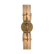 Double glass goblets of smoke hammered glass are suspended on either side of a ridged fixture of antique brass. This versatile sconce has a timeless historical feel and modern adaptability—it can be hung vertically and horizontally. Matching antique brass backplate. Damp-rated, although limited covered outdoor conditions may affect finish. Finish will vary.