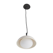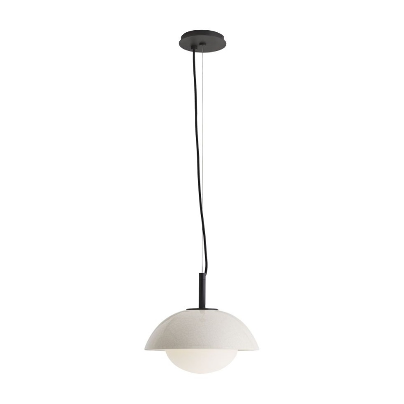 An ultra-versatile pendant that offers dynamic contrast through modern and seemingly handcrafted materials, light and dark hues and thoughtful detailing. The Glaze pendant's ceramic bowl shade is suspended from a knurled metal pin and woven fabric cord. The pendant's opal frosted glass provides a soft, flattering glow that is reflected and diffused by the shade's matte finish. Damp-rated, although limited covered outdoor areas may affect finish.