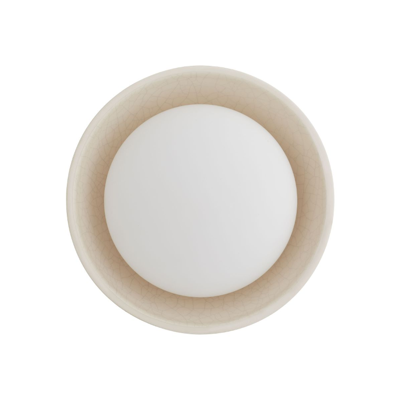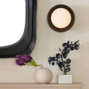 This simple, versatile form marries a ceramic shade and a softly frosted opal light for a versatile sconce that casts a flattering glow in any space. The effect is multiplied when installed in groupings or in combination with Glaze sconces for one-of-a-kind designs. Damp-rated, although limited covered outdoor areas may affect finish.