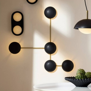 Striking on its own but created to play well with others, the Glaze sculptural sconce can be rotated and combined to create endless, unique patterns and wall compositions. Incredible alone or in multiples, the sculptural sconce will transform entries and corridors and create a compelling focal point in hospitality and other commercial applications. Dramatic backlight effect behind the stunning shades complimented by double frosted glass lights that cast a warm, flattering glow. Held by antique brass-plated steel. damp-rated, although limited covered outdoor areas may affect finish.