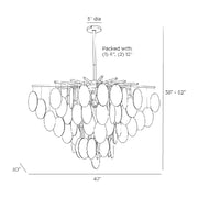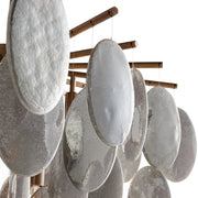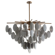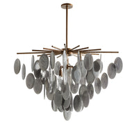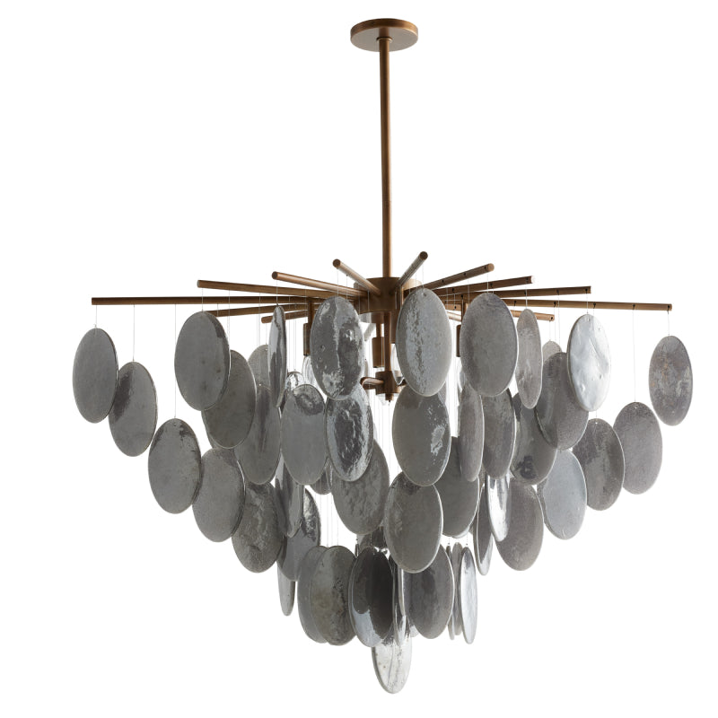 This eight-light chandelier is slightly whimsical. Smoke luster glass discs bring a modern feel to this stunning wind chime design. An antique brass iron frame anchors the piece while adding a hint of industrialism.