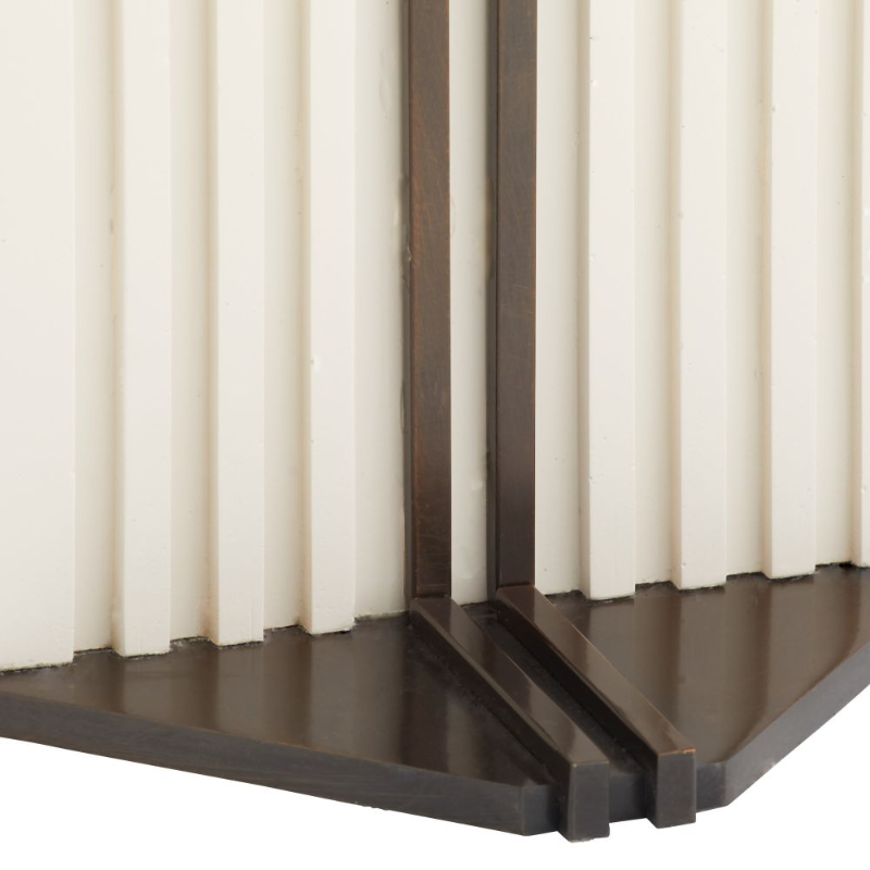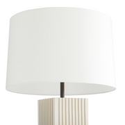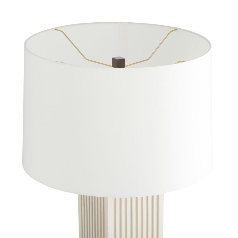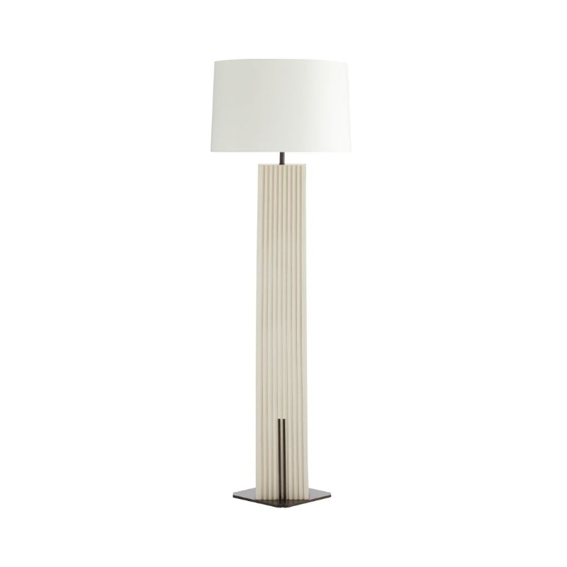 A twist on a classical Greek column adds an architecturally inspired accent to any modern space. Sculpted of ivory resin, this floor lamp is enhanced with contrast details of heritage brass-plated steel. Deco-inspired prongs anchor it securely to the square steel base. Finished with a matching finial and ivory microfiber drum shade lined in white cotton. Finish will vary.