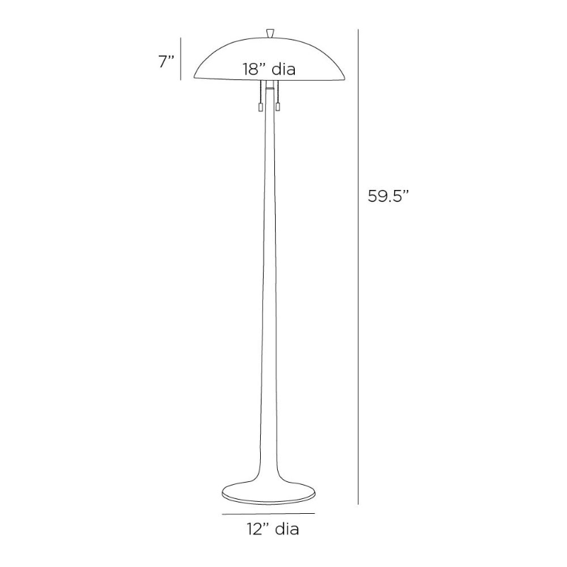 This floor lamp's trumpet base and gong shape update a Space Age silhouette. This reinvented form of vintage brass-plated aluminum possesses a subtle iridescence. A vintage brass-plated iron dome shade delivers instant mood-setting illumination. Double pull chains and matching finial.
