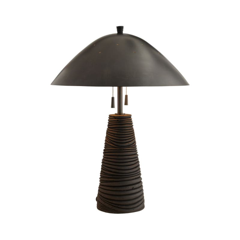 Crafted of black lava stone composite, the Fender has an eroded, ridged surface that lends textural intrigue. A helmet-like shade of bronze-plated steel reflects light to lend a moody vibe to any surface. Matching swirl texture finial and double bronze pull chains.