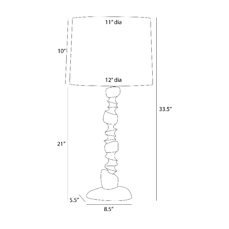 This modern totemic sculpture offers illumination along with its rhythmic shape. Reminiscent of stacked river stones, the ivory ricestone composite base delivers an implied movement that is even more dynamic when displayed in a pair on a console or credenza. Topped with an off-white linen drum shade and lined in off-white cotton. Finished with an antique brass hardware and finial. Finish will vary.