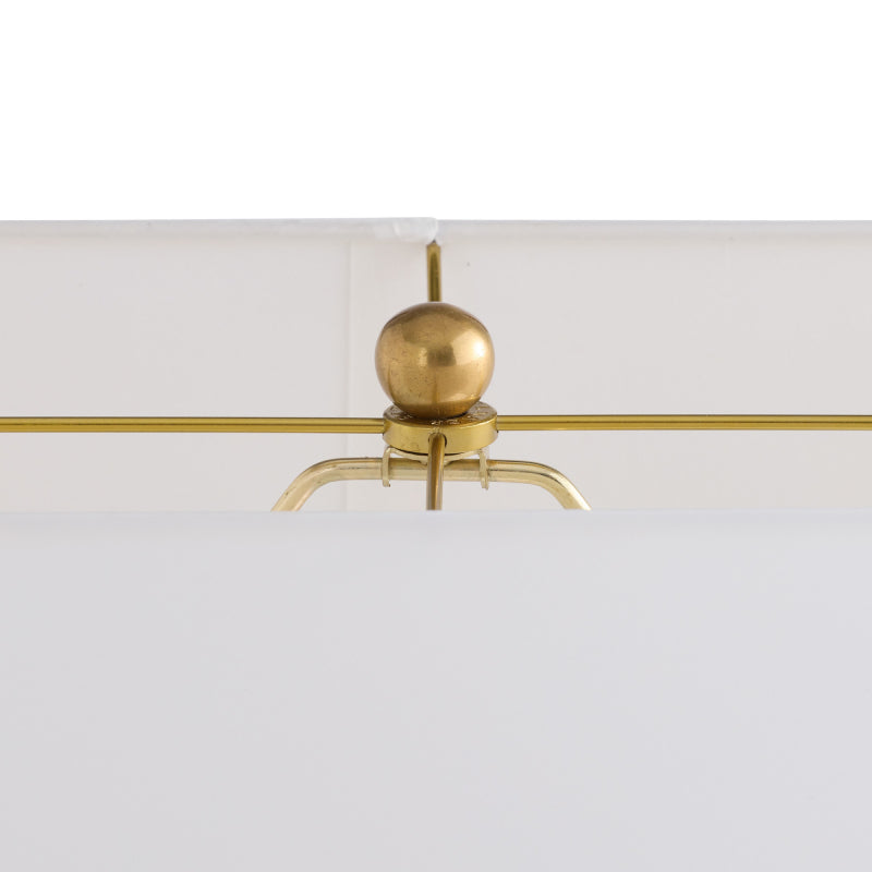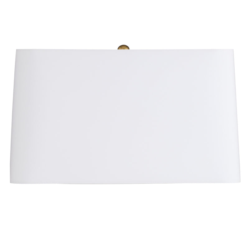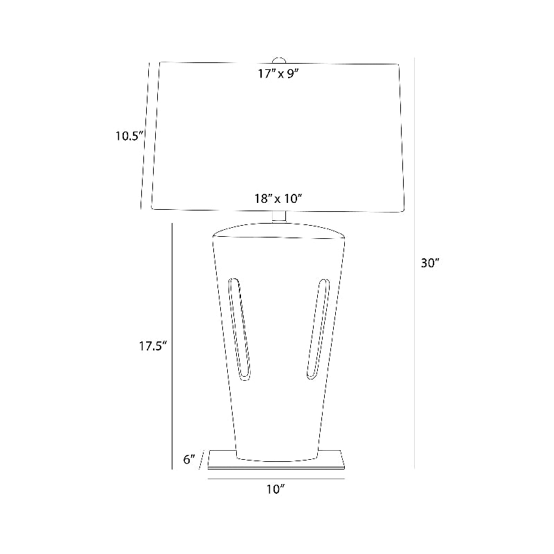 The angular form of our porcelain style offers an intriguing mix of positive and negative space, with a cross-hatched texture that emphasizes its craft. Cutout slots provide added interest, while the shoreline reactive glaze offers a gradient finish that shifts from deepest black to pure ivory. Finished with bronze steel base, an off-white microfiber rectangular drum shade lined in off-white cotton and an antique brass sphere finial. Finish will vary.