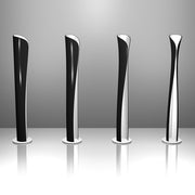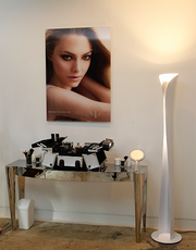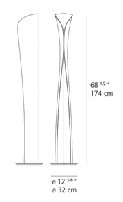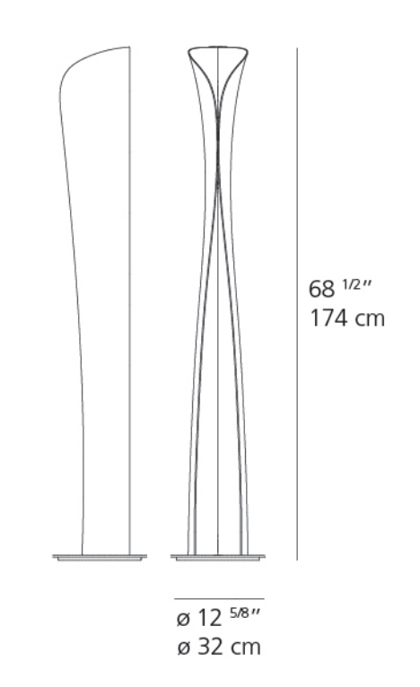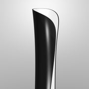A curved aluminum panel envelopes and releases soft indirect light upwards while a separate source emits diffused light along the vertical aperture of the lamp.