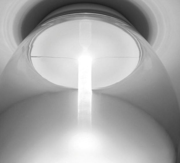 Ceiling/wall mounted luminaire for diffused lighting. Base in painted white die-cast aluminum. Diffuser in handblown glass, clear towards the ceiling/wall and frosted at the bottom to allow reflection of the light without glaring and without losing efficiency.