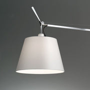 TOLOMEO W/ SHADE Table base and cantilevered arms in polished aluminium; diffuser in parchment paper or in silk satin fabric on a plastic frame; joints in polished aluminium. System of spring balancing.