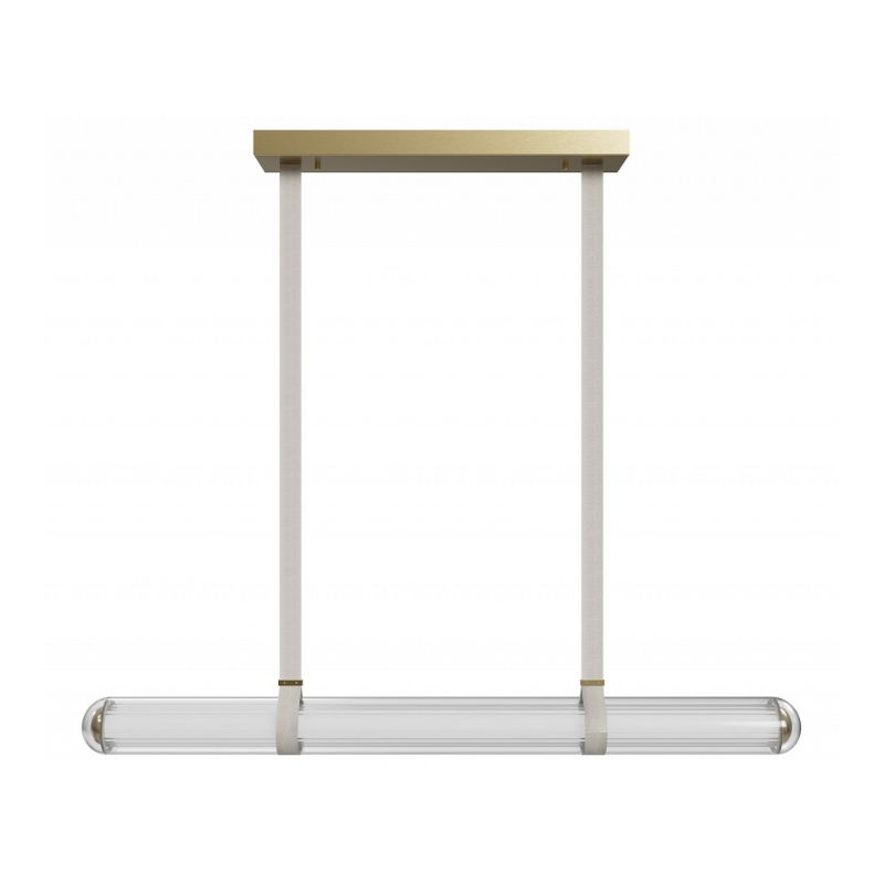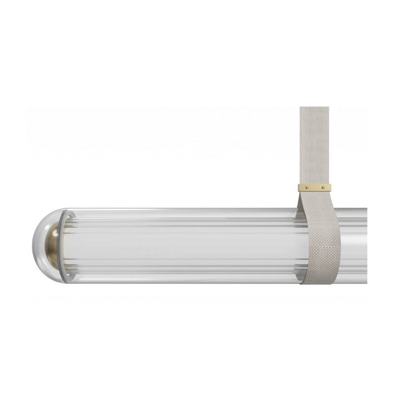 The Nautilus Linear LED Fixture harmoniously blends elegance and innovation. Ribbed glass encased in a clear tube creates a mesmerizing play of light reminiscent of sunlight glimmering on the ocean. Accentuated with aged brass accents and suspended by our signature belt system, it exudes modern sophistication while appearing to float effortlessly. More than a fixture, it transforms any space into a sanctuary of timeless beauty and refinement.