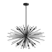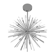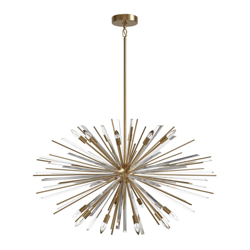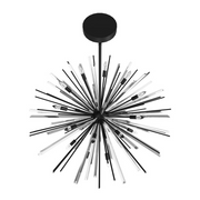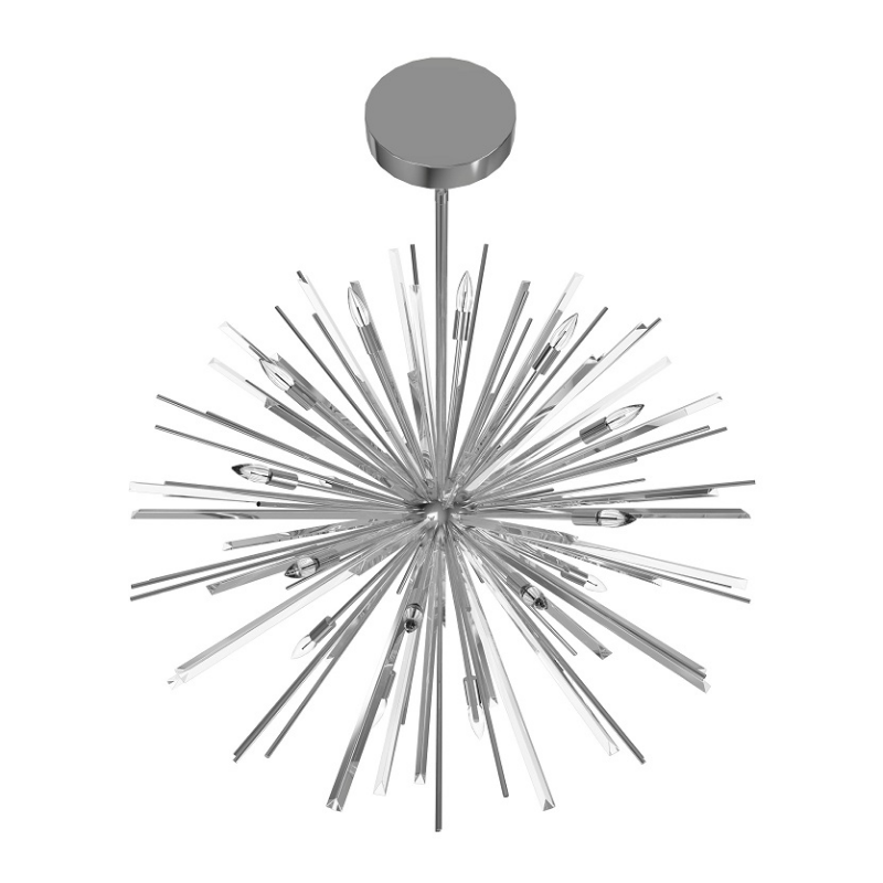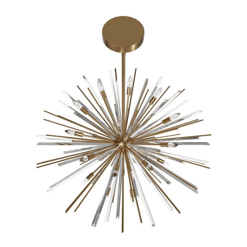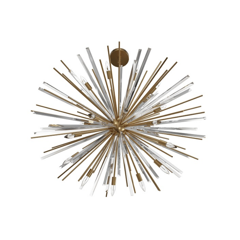 Our Palisades Avenue Collection's metal frame features a sputnik inspired silhouette complemented by bursting rays of glass and metal spokes, bringing a touch of glamour and sophistication to your space.