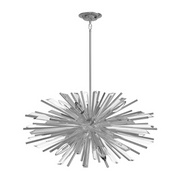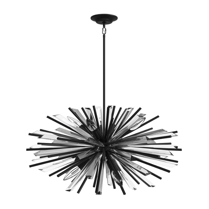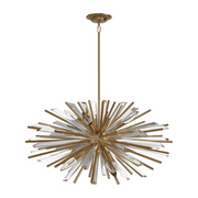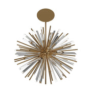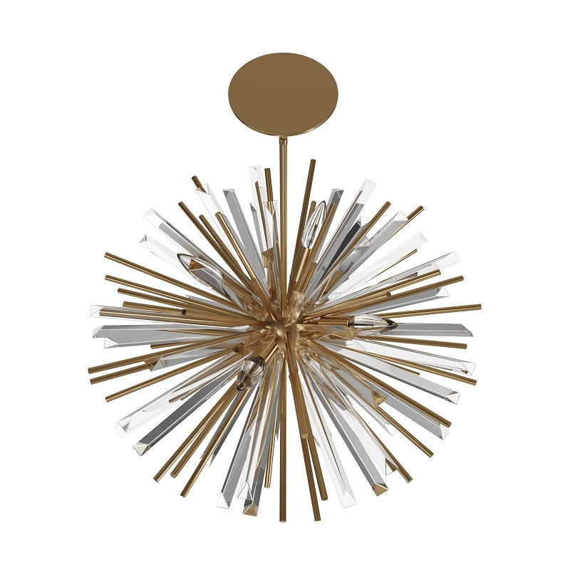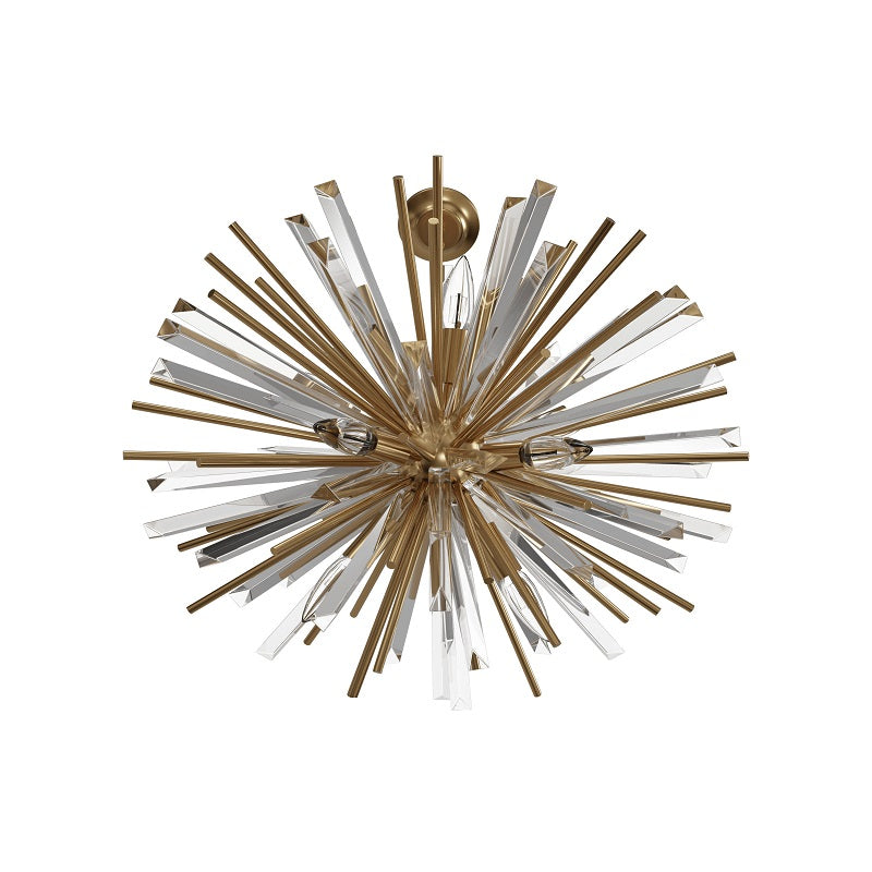 Our Palisades Avenue Collection's metal frame features a sputnik inspired silhouette complemented by bursting rays of glass and metal spokes, bringing a touch of glamour and sophistication to your space.