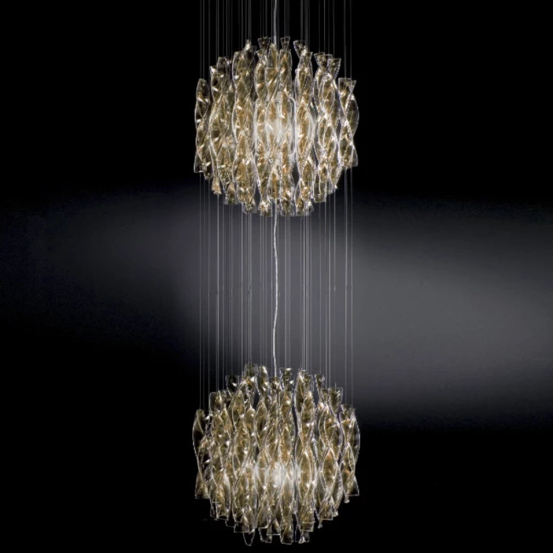 Waves of light, dynamic reflections, uniqueness. The knowledge and craftsmanship of a master glassmaker express themselves in the shape of small glasses that together compose a fluid and aquatic image with a diffused glow.