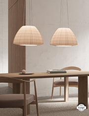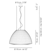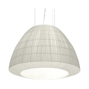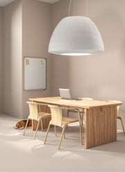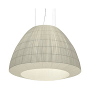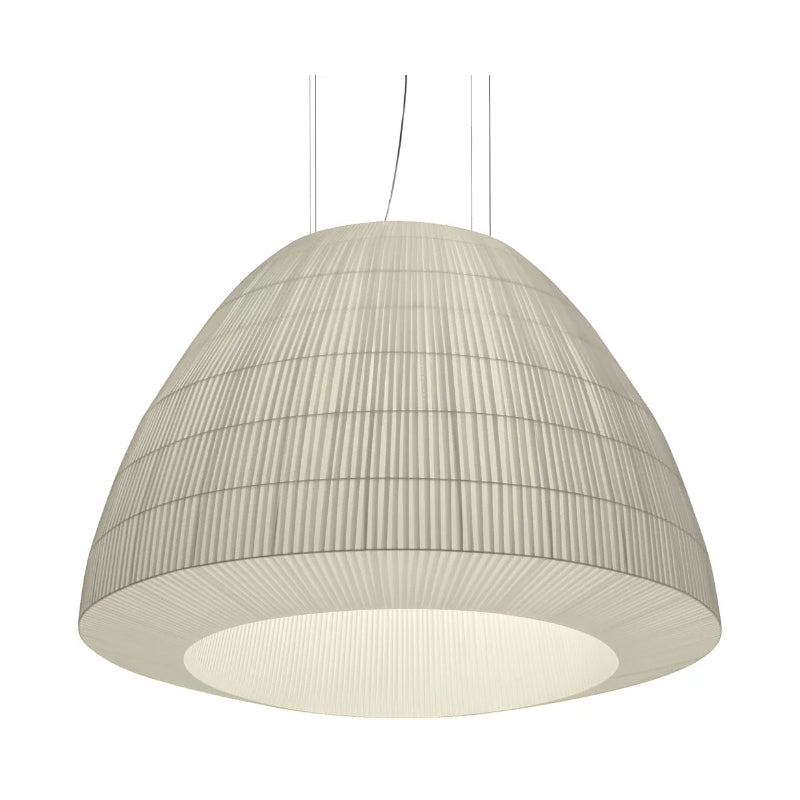 Bell, in its pendant version, reinterprets the dome shape in an original way. Despite its important volume, the soft lines and the lightness of the fabric make Bell a lamp that does not burden the environment. Thanks to its chromatic and dimensional variations, Bell fits different styles and projects, personalizing any space. Bell brings together an important aesthetic identity, excellent lighting performance and acoustic properties in one. Its pongé fabric in fact, thanks to its texture, is both flame-retardant and acoustic.