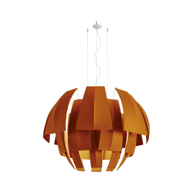 Plumage is a unique collection with a dynamic design, thanks to its peculiar feathers. These overlap rhythmically, creating amazing light effects. The multidimensionality and the variety of colors make Plumage a versatile lamp. Despite its great volumes, Plumage is light, like its feathers, exalted in the pendant version. Its fabric has excellent sound-absorbing capacities, in addition to being fire-retardant.
