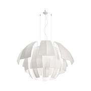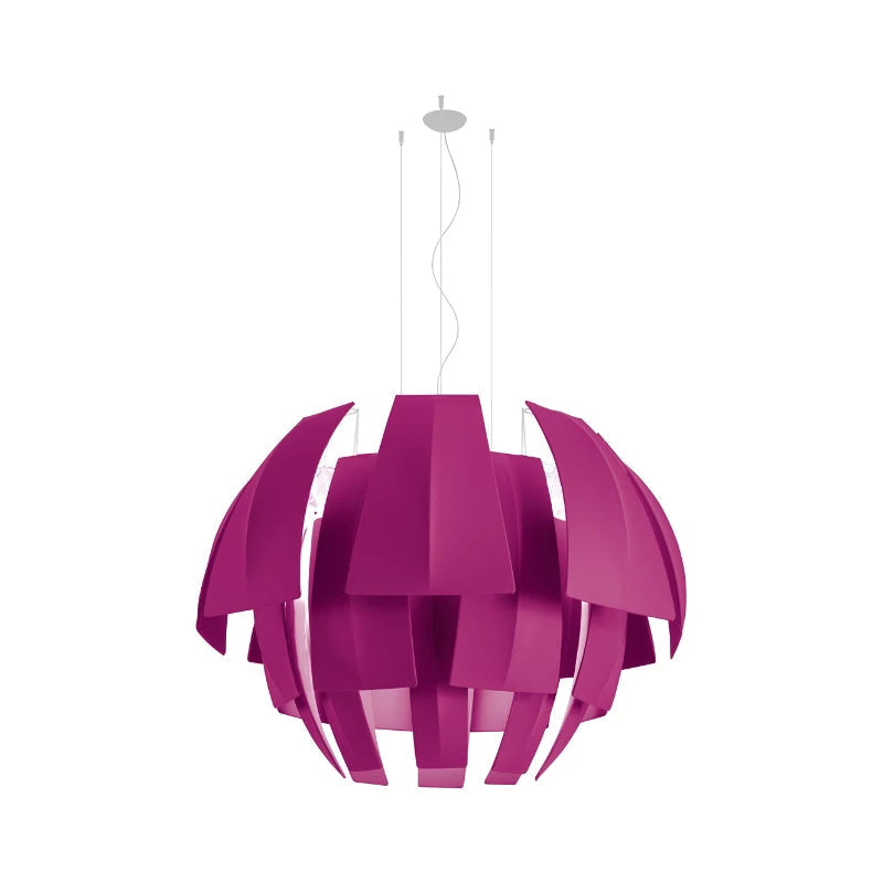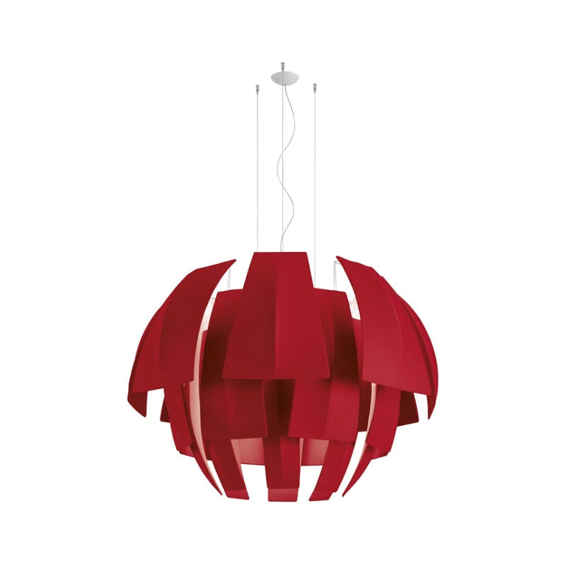 Plumage is a unique collection with a dynamic design, thanks to its peculiar feathers. These overlap rhythmically, creating amazing light effects. The multidimensionality and the variety of colors make Plumage a versatile lamp. Despite its great volumes, Plumage is light, like its feathers, exalted in the pendant version. Its fabric has excellent sound-absorbing capacities, in addition to being fire-retardant.
