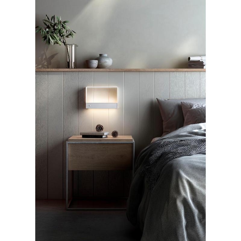 Kira arises from the need to add new basic wall fixtures with different features or formats for retail or contract channels. With a fresh and lightweight design, Kira is mainly intended to be used in bedrooms. The Kira wall fixture is a light box that emits an aura of warm luminosity around its inner perimeter. In addition, it emits lower light through an LED plate and there is the option to add a button with 3 dimming settings.