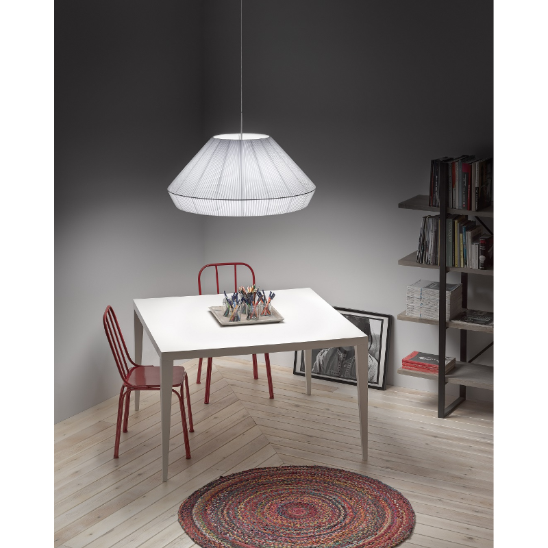 The Mei lamps are great for environments where a warm light is required. They mostly have a wide diameter, offering as a result a good direct light. Discrete and decorative since its mechanical structure is hidden inside the lamp, as if they were in a second place. Lamps are held by thin tensor wires that enhance its lightness.