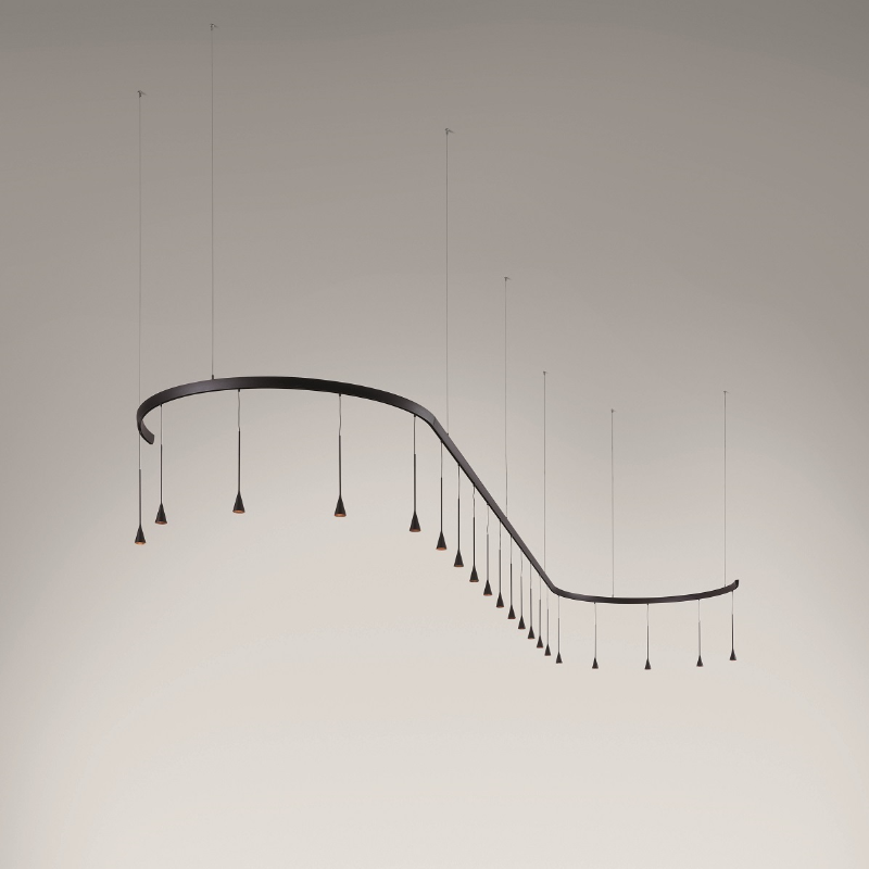 Skybell is an extensive system of light structures, designed to adapt to any type of application. Their main characteristic is the image they give off, they are subtle and cheerful. They breathe a point of fantasy and freedom in their applications because they can be combined in variations, mixing their 4 sizes, until they achieve a more personal and dynamic lamp concept or they can keep all the ‘bells’ in the same length, achieving a more traditional image.