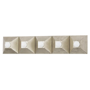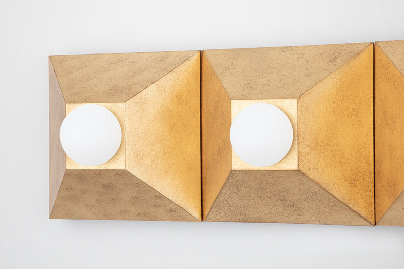 Playing with shapes, Max gives simple geometry maximum style. A series of pyramid bases supporting round globe lights come together to form squares and rectangles. The vintage gold or silver leaf finishes add to the design's overall Hollywood glam feeling. Whether in a flush mount, sconce or bath and vanity, Max adds a chic vibe to any space.