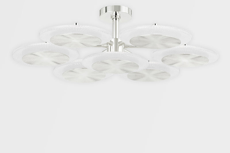 Simply put, Topaz is simply stunning. Rippled disks of polished brass or nickel rest on larger disks of piastra ice glass. Light fills the piastra glass shade and cascades down to reflect off the etched metalwork; the effect is absolutely dazzling.