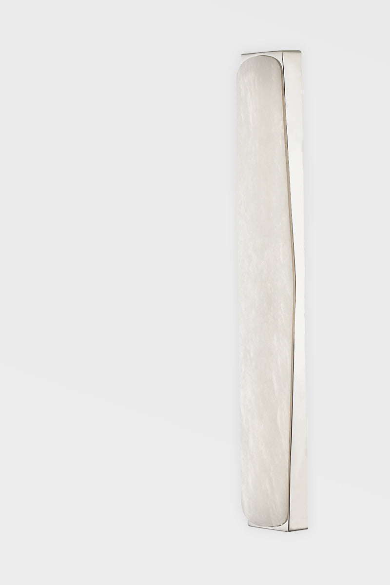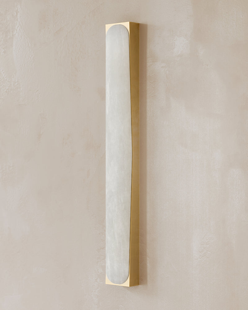 Thoroughly modern, Millie is clean and simple. A luxurious piece of Spanish alabaster is set within a subtlety waxing and waning frame of vintage brass or burnished nickel. While the alabaster is gorgeous unlit, it comes to life when lit, filling the fixture, and the room, with a warm, inviting glow.