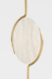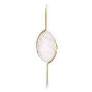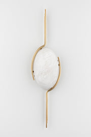 Like jewelry for the wall, Lapis adds beauty and makes a stylish statement. A smooth oval of Spanish alabaster is hugged on each side by delicate, intricately detailed curves of vintage brass. The metalwork is purposefully left open in areas to add visual interest and allow light to flow freely from the shade and reflect off the vintage brass.