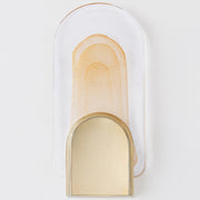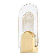 This beautiful modern sconce features a rounded piece of clear cast glass displayed within a smooth Gold Leaf bracket.