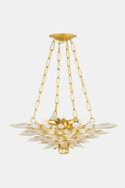 Elegant tiers of sparkling hand-cut Craquelle Crystal create this highly textural and romantic fixture. Reminiscent of a peacock, the crystal are suspended within a Gold Leaf framework that brings a sparkling, luxurious quality to any space. The interplay of shapes and light from the layered silhouette, coupled with the elegant materiality, creates a striking visual display overhead.