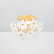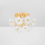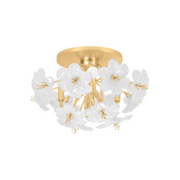 An airy spray of white glass flowers forms the cloud-like silhouette of Hygea. Gold Leaf arms act as stems, supporting the delicate blooms as they gently diffuse light. Available as a wall sconce, flush mount, or chandelier in two sizes, Hygea casts a bright glow over modern interiors.