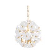 An airy spray of white glass flowers forms the cloud-like silhouette of Hygea. Gold Leaf arms act as stems, supporting the delicate blooms as they gently diffuse light. Available as a wall sconce, flush mount, or chandelier in two sizes, Hygea casts a bright glow over modern interiors.