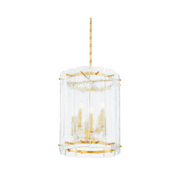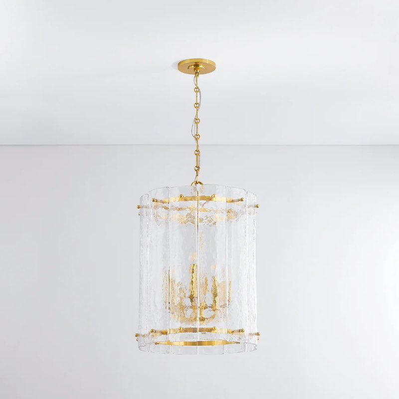 With hand-blown Piastra glass, this statement pendant reimagines a traditional lantern as an aquatic vision. Resembling water, the rippled glass silhouette diffuses and reflects the light coming from within. Vintage Brass pins and chains suspend the fixture, bringing a sense of the old world to the contemporary materiality. Available in three sizes as a lantern or as a flush mount. *Due to the one-of-a-kind nature of the medium, exact colors and patterns may vary slightly from the image shown.