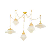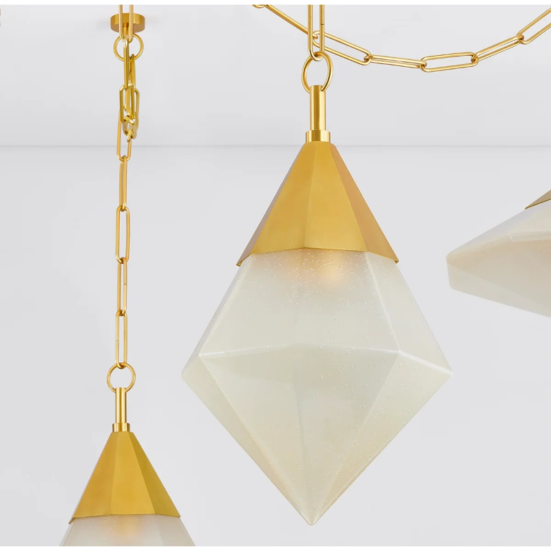 Inspired by the timeless allure of diamonds, Angelique features a cluster of geometric pendant lights with sparkling seeded glass facets. Suspended from a Vintage Brass chandelier, each pendant glows on a different level to create a luxe visual display overhead. The distinctive hand-blown glass bubbles resemble raindrops when the fixture is lit. Available in two sizes, Angelique brings an element of mysticism to interior design.