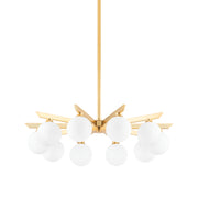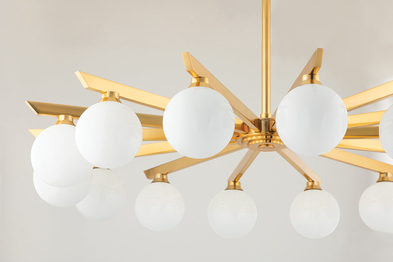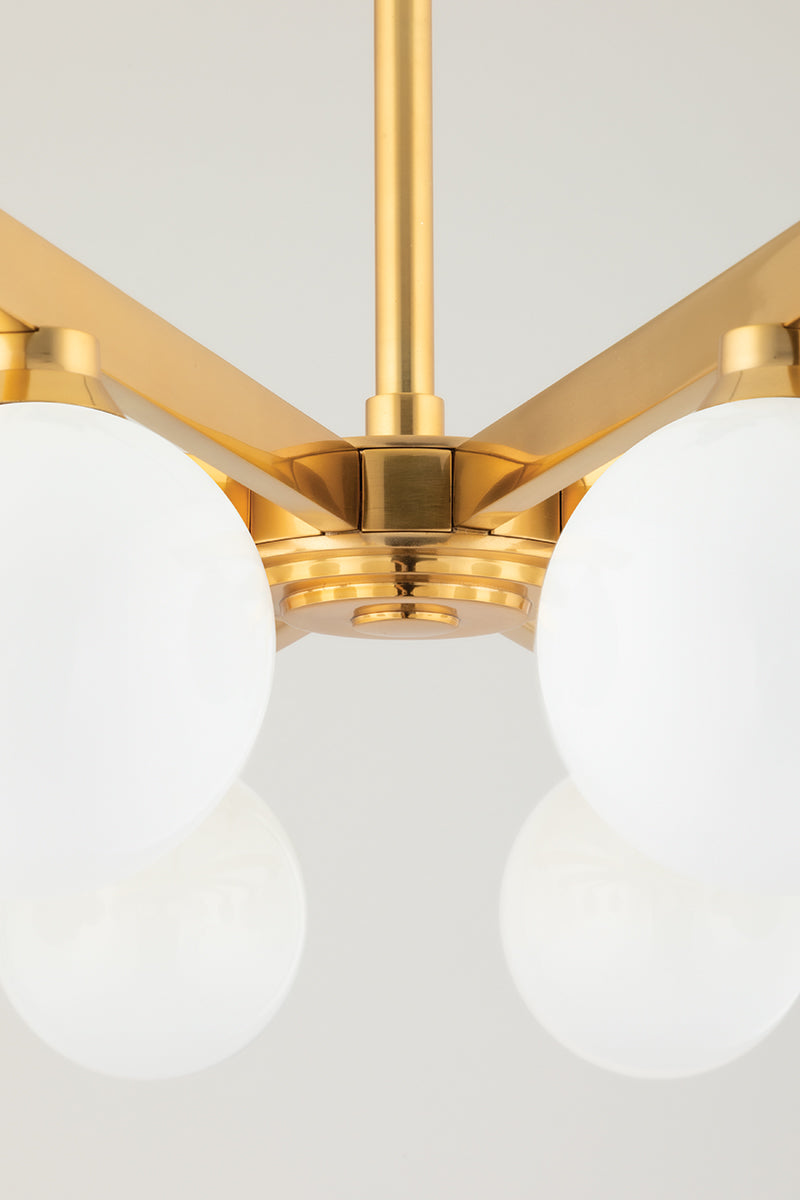 Astra is close to the ceiling and far from ordinary. Opal shiny glass globes suspend from arms of vintage brass. The arms extend evenly from a central focal point casting beautiful light in every direction. With its air of vintage Hollywood glam, this stylish semi flush and chandelier takes centerstage in any space.