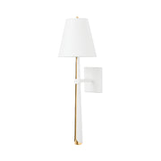 Simple and elegant, Esmeralda's statuesque form adds a sense of refinement to any space. A long tapered arm of vintage gold leaf is delicately wrapped in textured black or soft white gesso, purposefully exposing a sliver of the gold underneath. Light fills the white linen shade with a clean glow and radiates off the metalwork below.