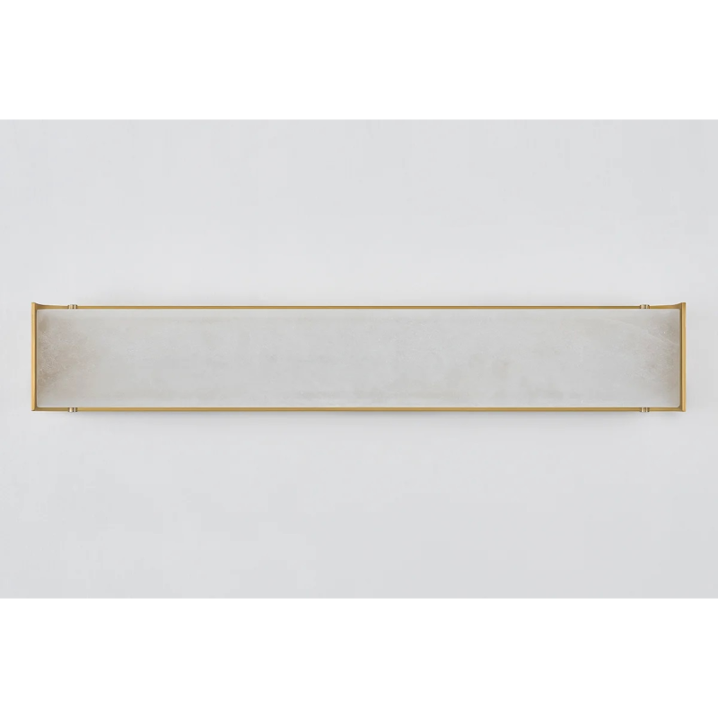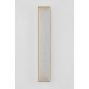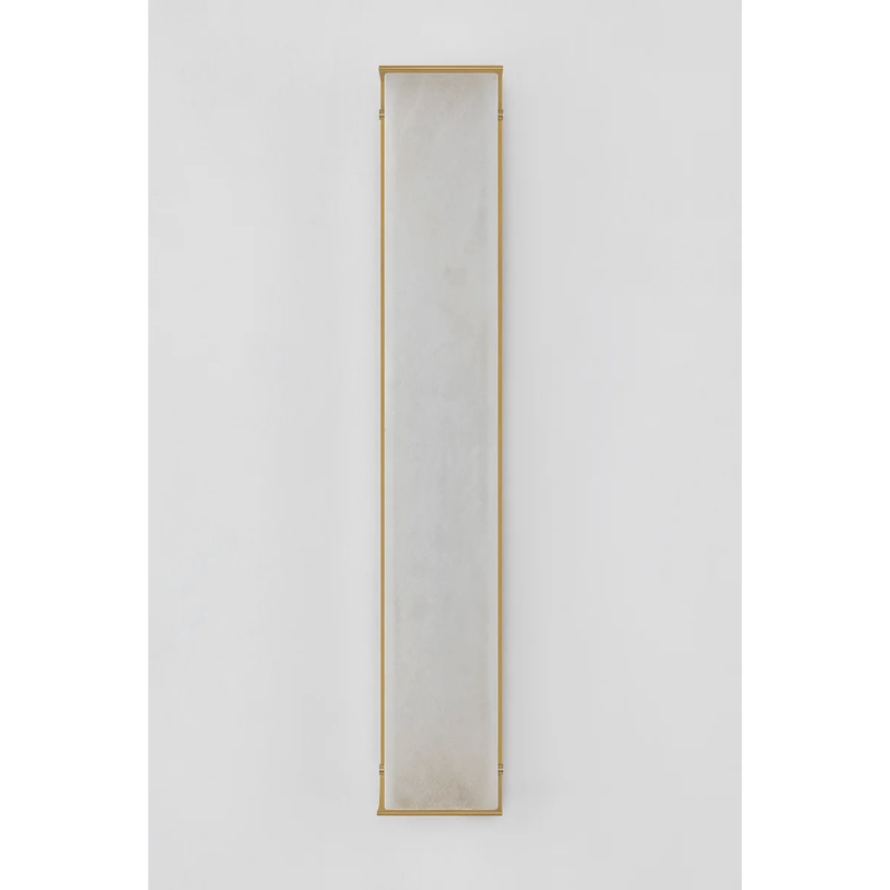 Inspired by the grandeur of Greek architecture, this statuesque wall sconce features a thick alabaster stone slab ensconced within a Vintage Brass frame. With its natural veining and translucency, the ivory alabaster reveals its color and texture when lit. Available in two sizes, Hera presents a striking visual display in a hallway or bathroom. *Due to the one-of-a-kind nature of the medium, exact colors and patterns may vary slightly from the image shown.