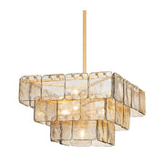 Three tiers of dark champagne piastre glass panels glisten with icy radiance in this striking chandelier. The shimmering surface, textural depth, and smoky hue of the glass combine to create a truly enchanting visual display overhead.
